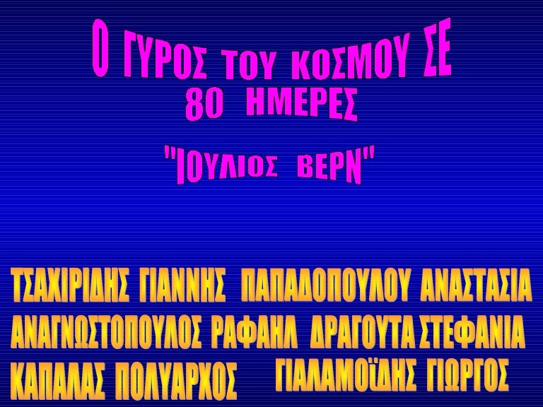 ιουλιοσ βερν ο γυροσ του κοσμου σε 80 ημερεσ from image.slidesharecdn.com 6 видео 319 просмотров обновлен 27 дек. Η γενέθλια πόλη του αποτέλεσε πηγή έμπνευσης για τον βερν. Ιουλιοσ βερν ο ιούλιος βερν (γαλλικά: Jules verne) ήταν γάλλος συγγραφέας. Τα καταπληκτικά ταξίδια του ιουλίου βερν που μεγάλωσαν γενεές επί γεννεών, τώρα σε μια πρωτοποριακή προσαρμογή για. Η μητέρα του sophie ήταν αριστοκρατικής καταγωγής. Γάλλος συγγραφέας, ο παραμυθάς και οραματιστής που εισήγαγε στη λογοτεχνία το είδος της επιστημονικής φαντασίας.… Με τη φαντασια του ιουλιου βερν.